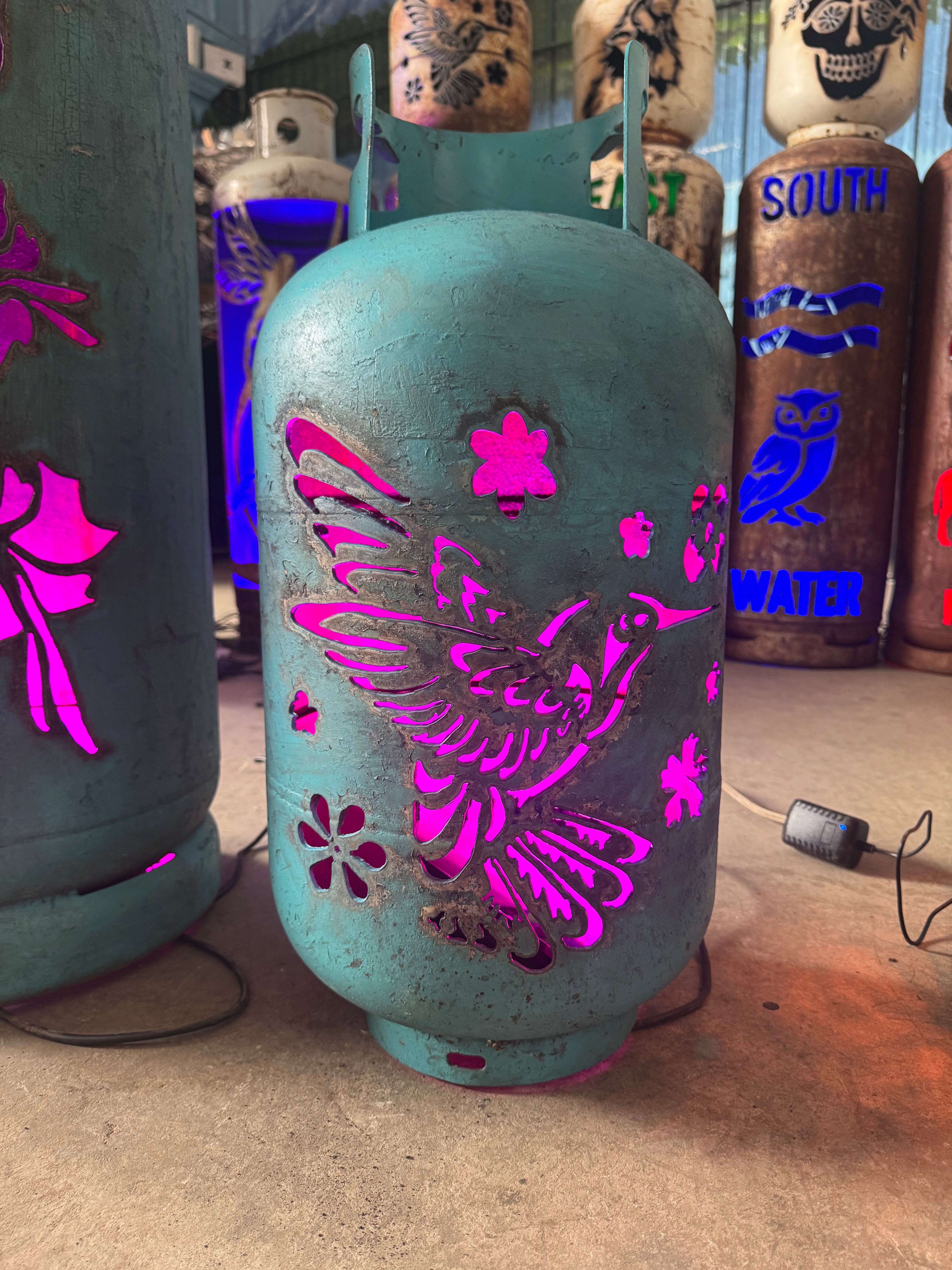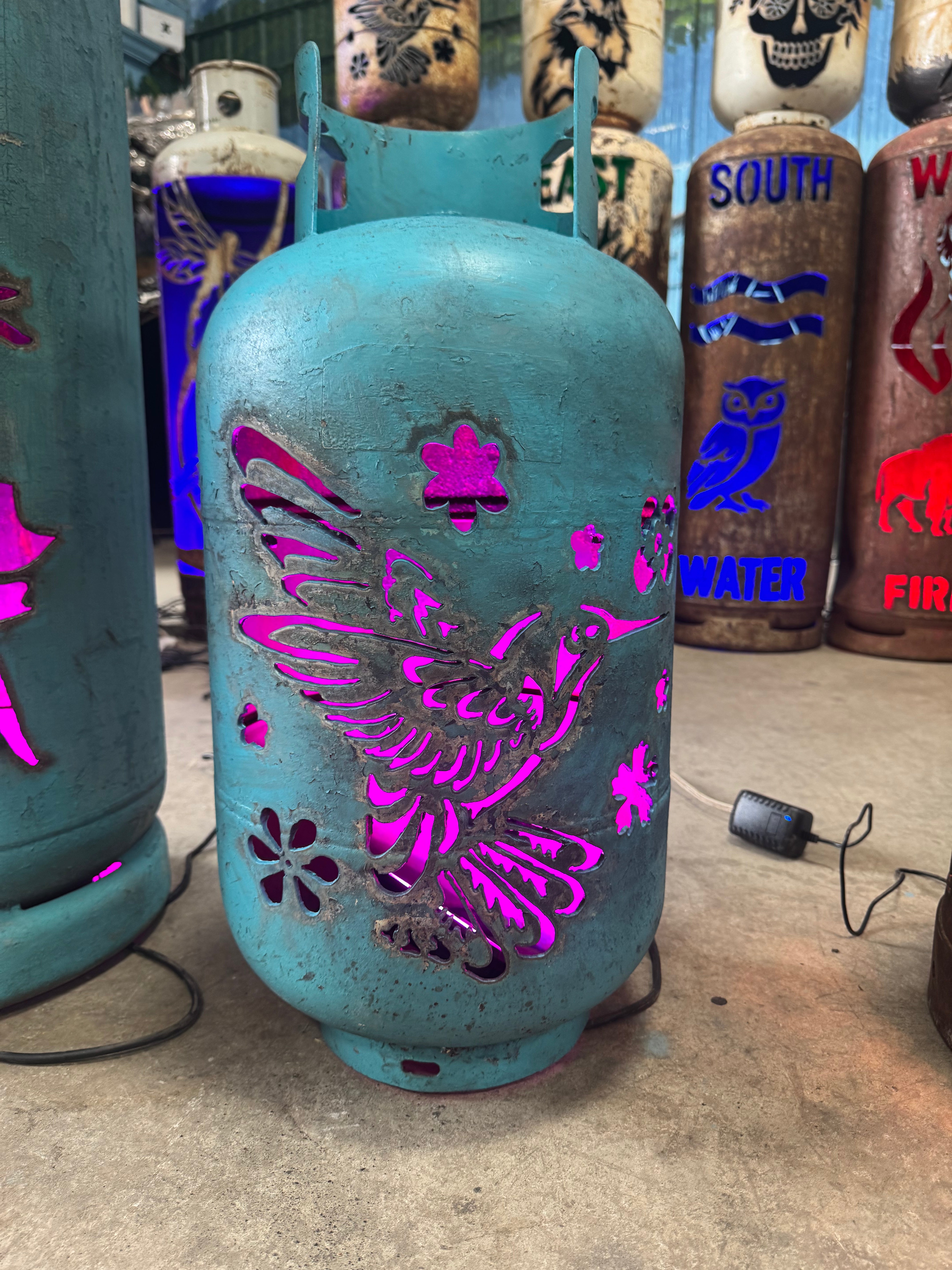 30lb Upcycled Patio Lantern, Blue patina Hummingbird