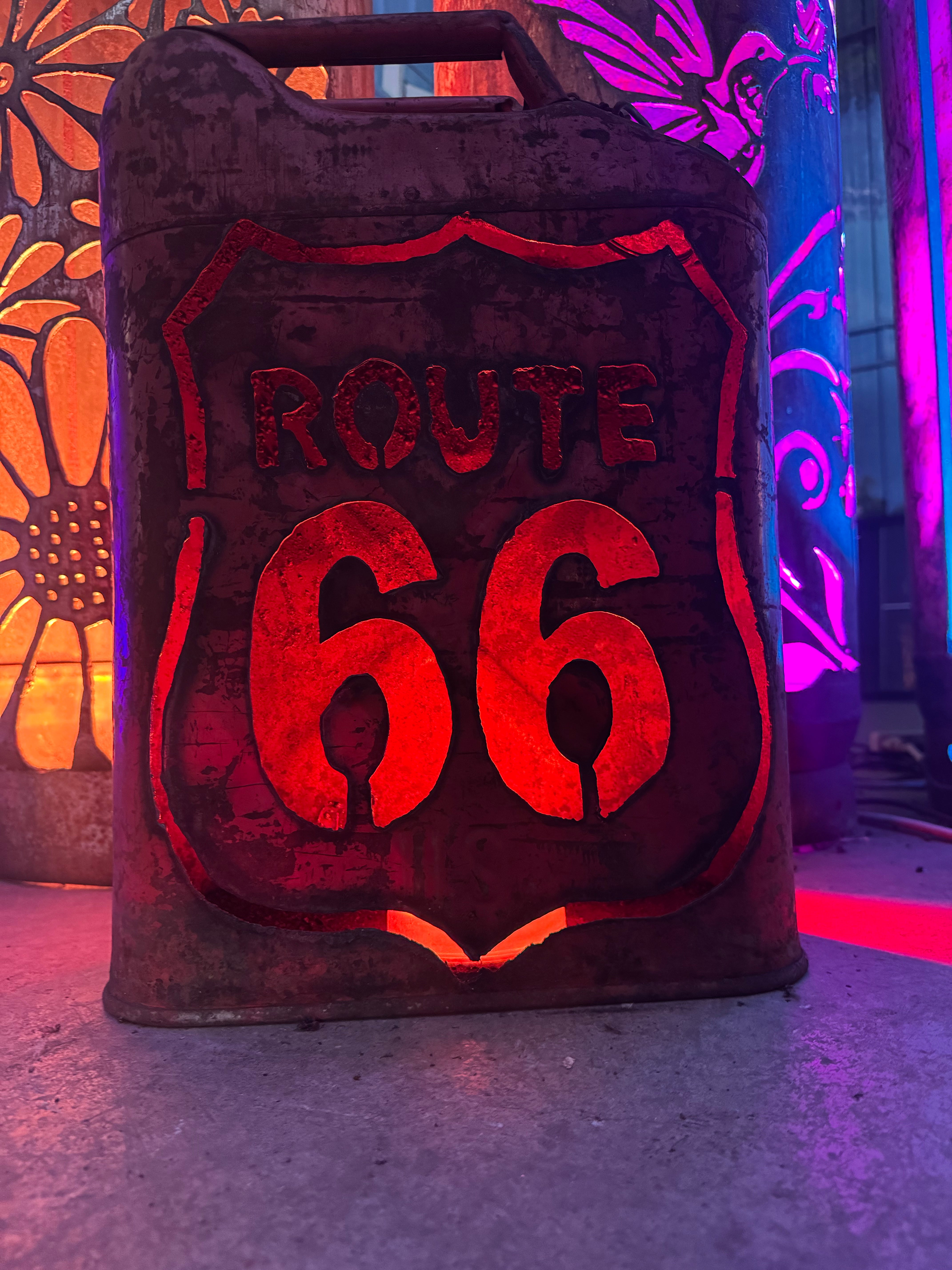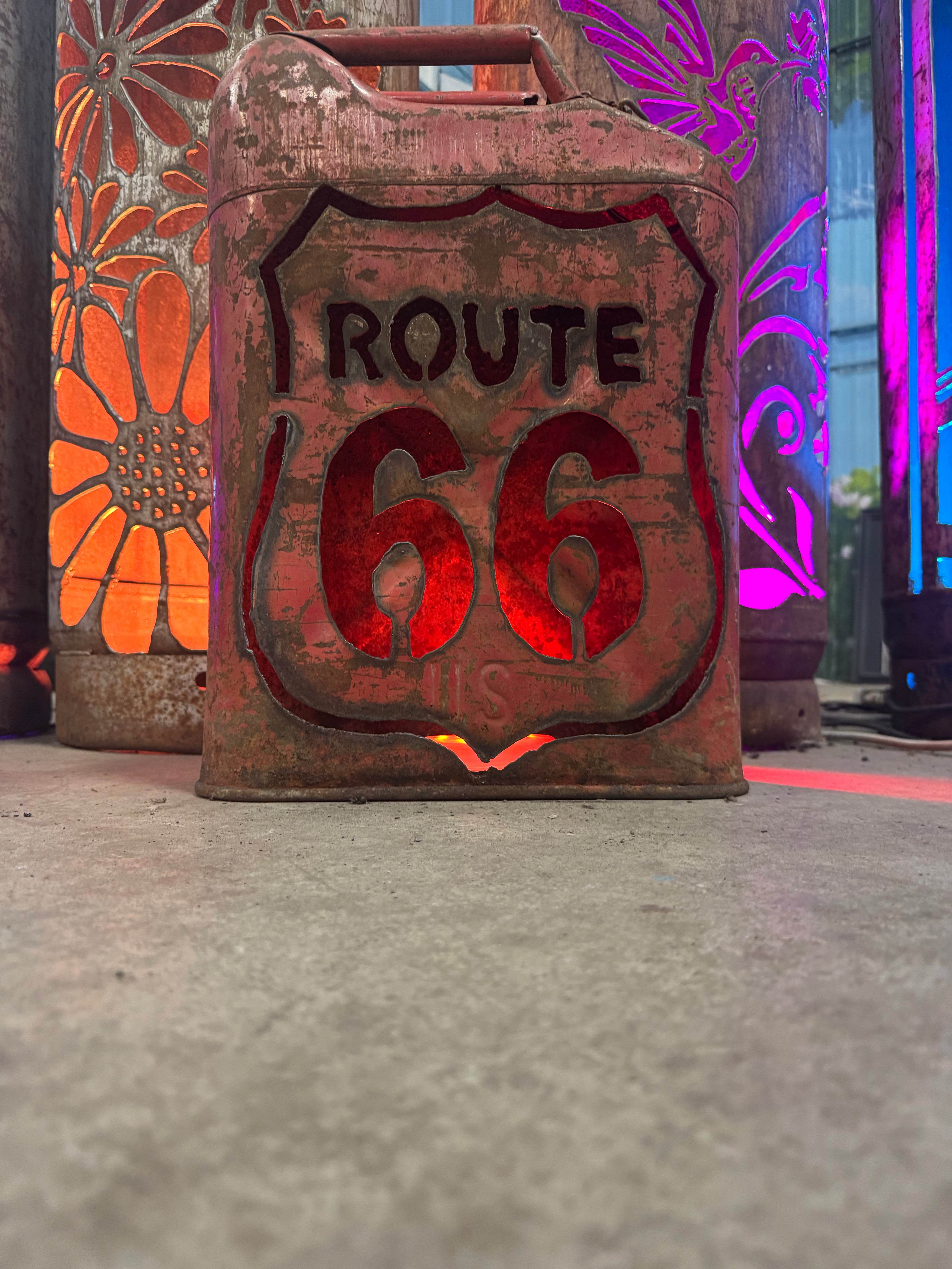 L30lb Upcycled Patio Lantern, Route 66 Gas Can *light incuded*