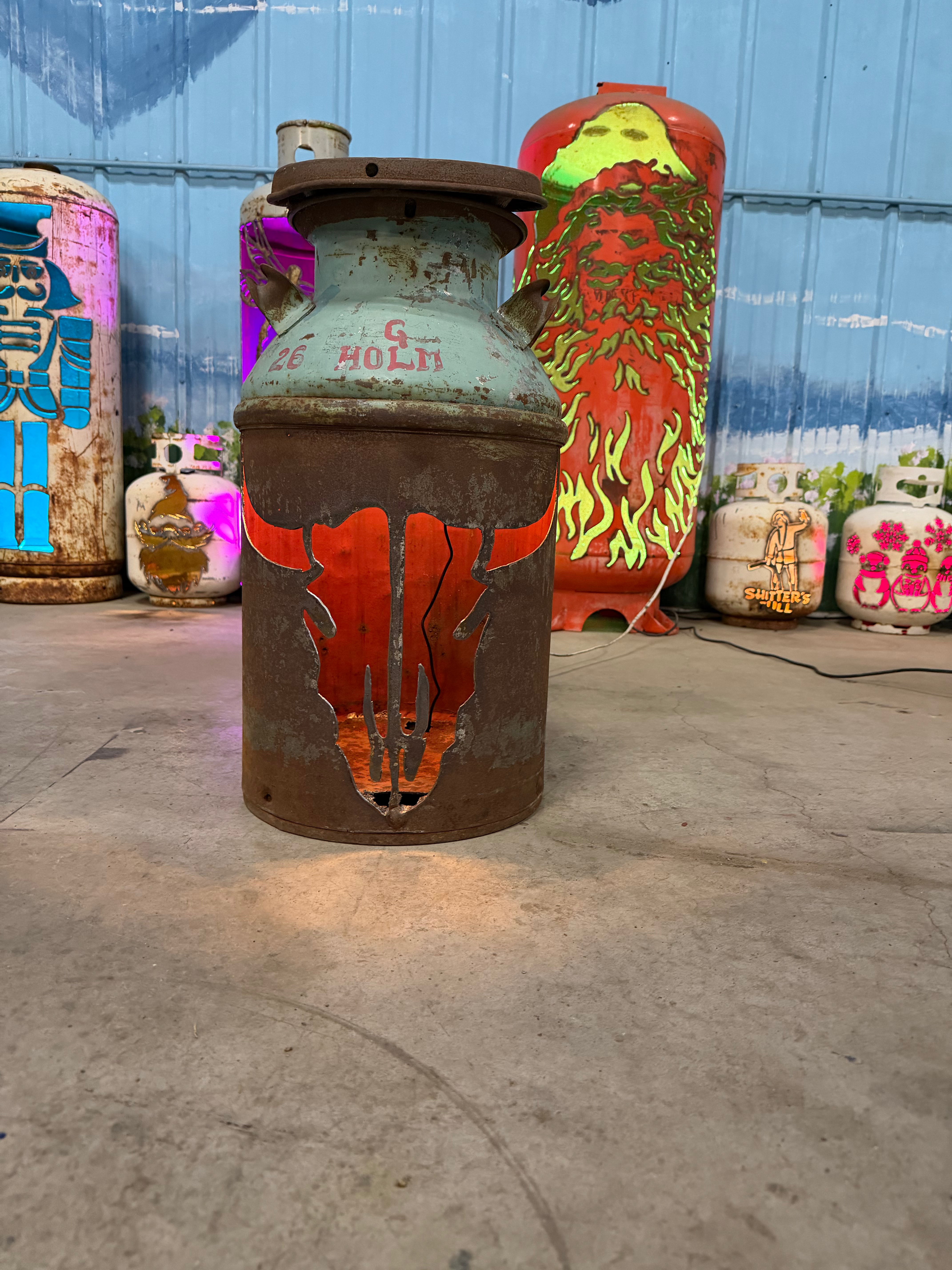 Cream Can Upcycled Patio Lantern, Cow Buffalo Skulll