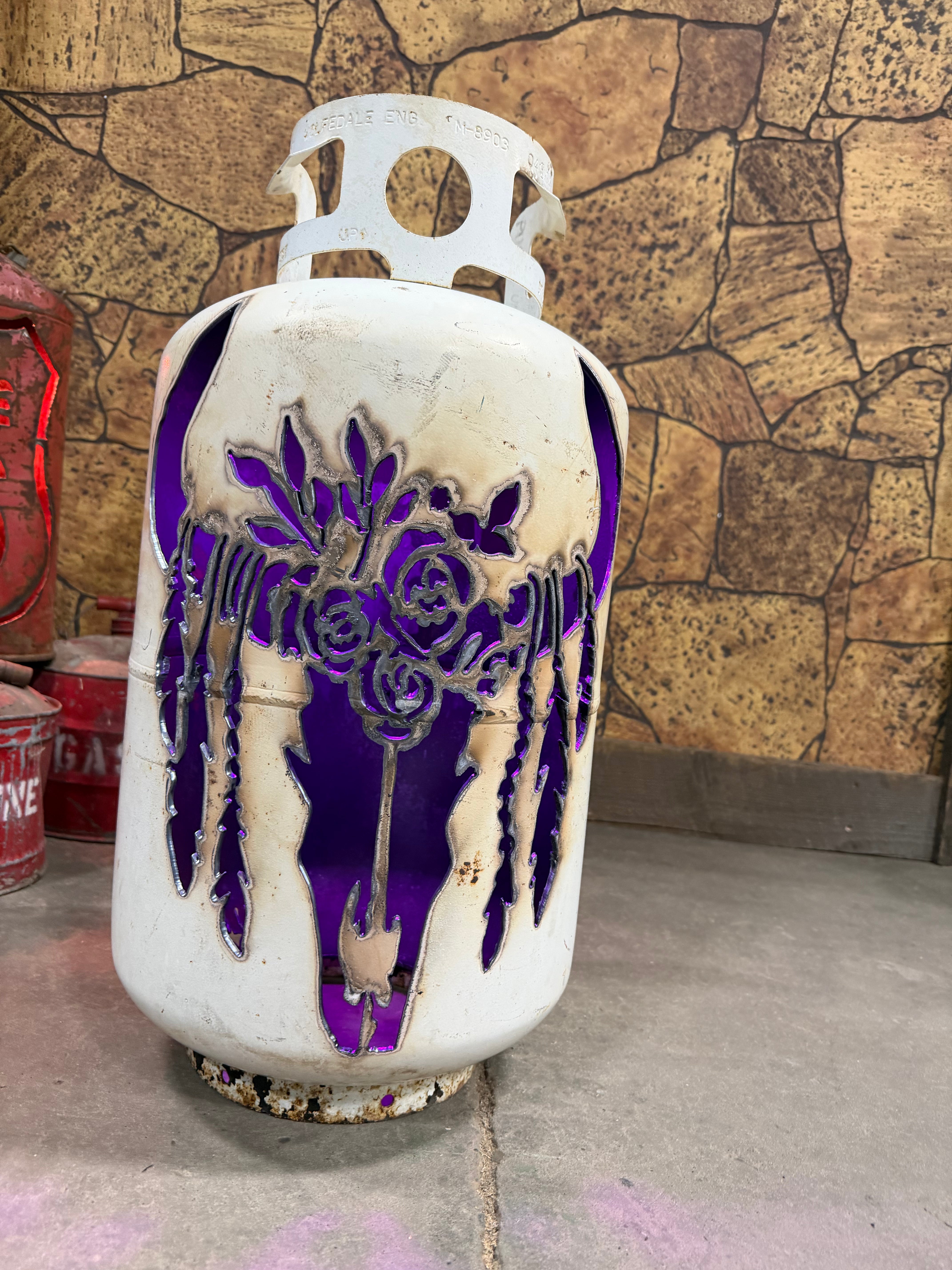 30lb Upcycled Patio Lantern, Dusty Floral Skull and Hornss