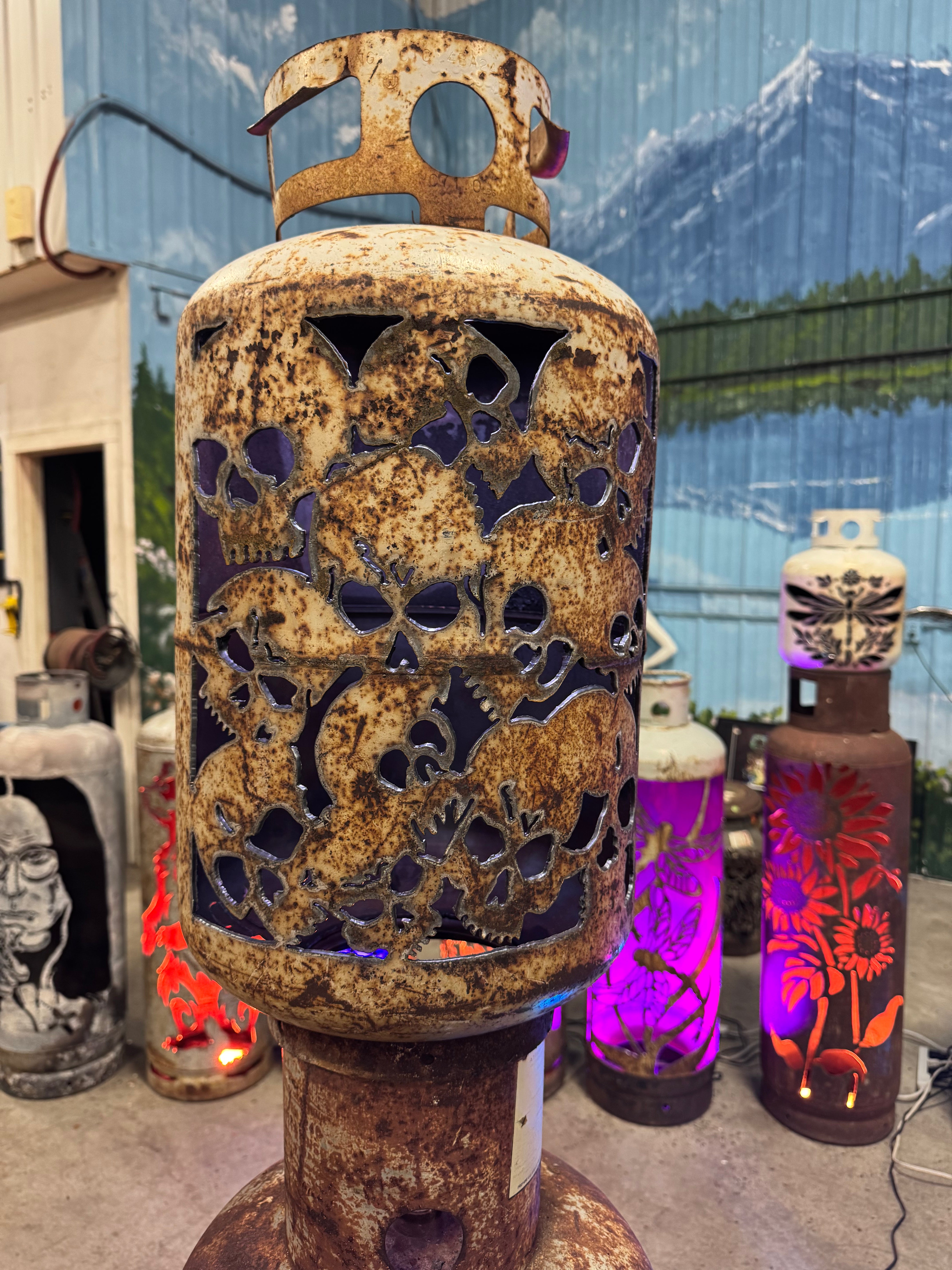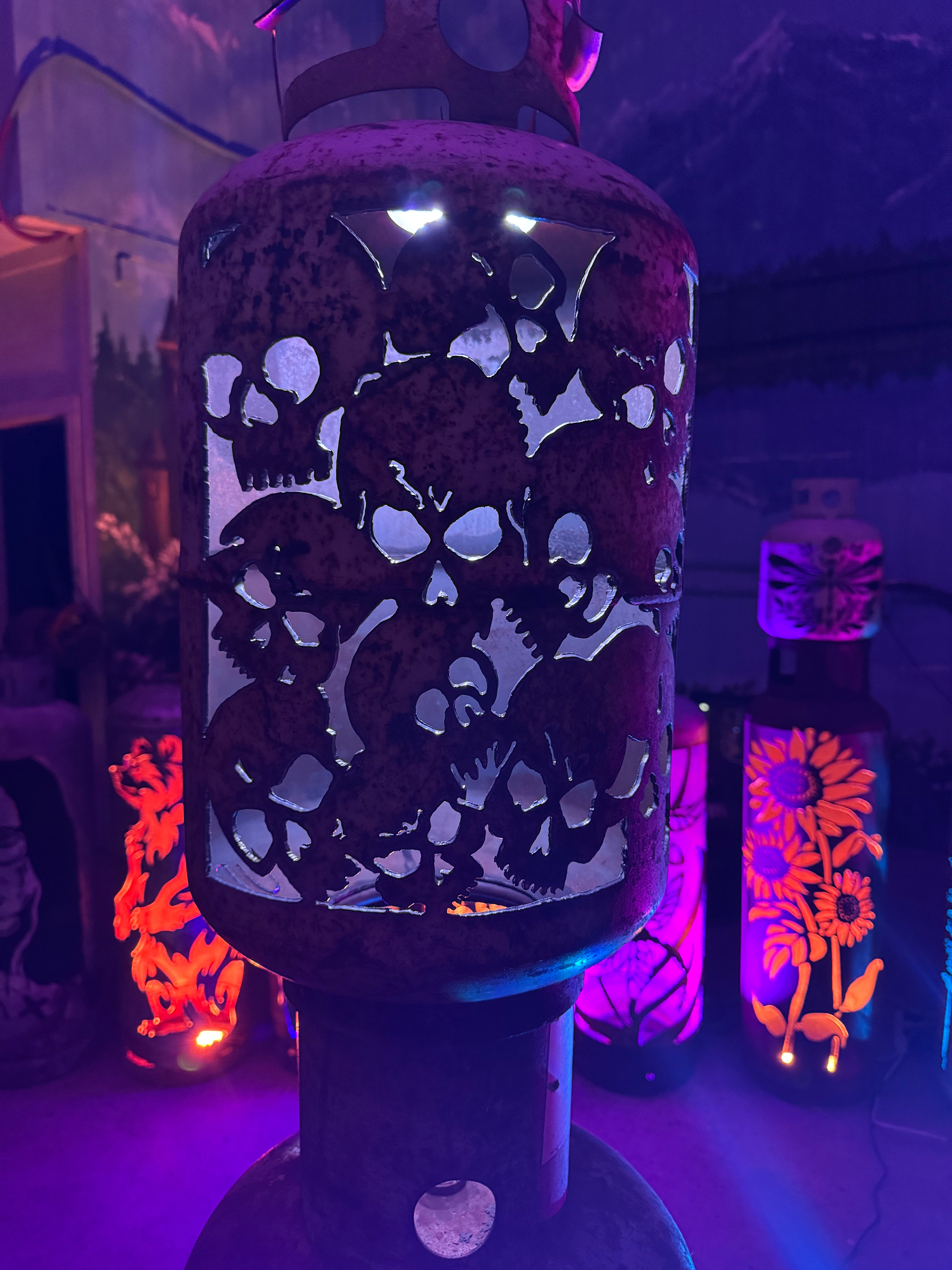 Who says pumpkins have to rot on the porch? These upcycled patio pumpkins bring halloween spirit with a heavy-duty twist. Each retired tank is cut, cleaned, and carved into spooky jack -o'-lanterns, wicked skulls, or eerie haunted faces. The thick cut steel makes them reusable year after year - just drop a LED and watch the glow pour through the cutouts. Perfect for porches, pathways, or even that creepy corner of your yard, they blend rustic salvage with festive fun. A sustainable way to celebrate Halloween, these patio lanterns prove that one person's scrap metal is another's seasonal showstopper!