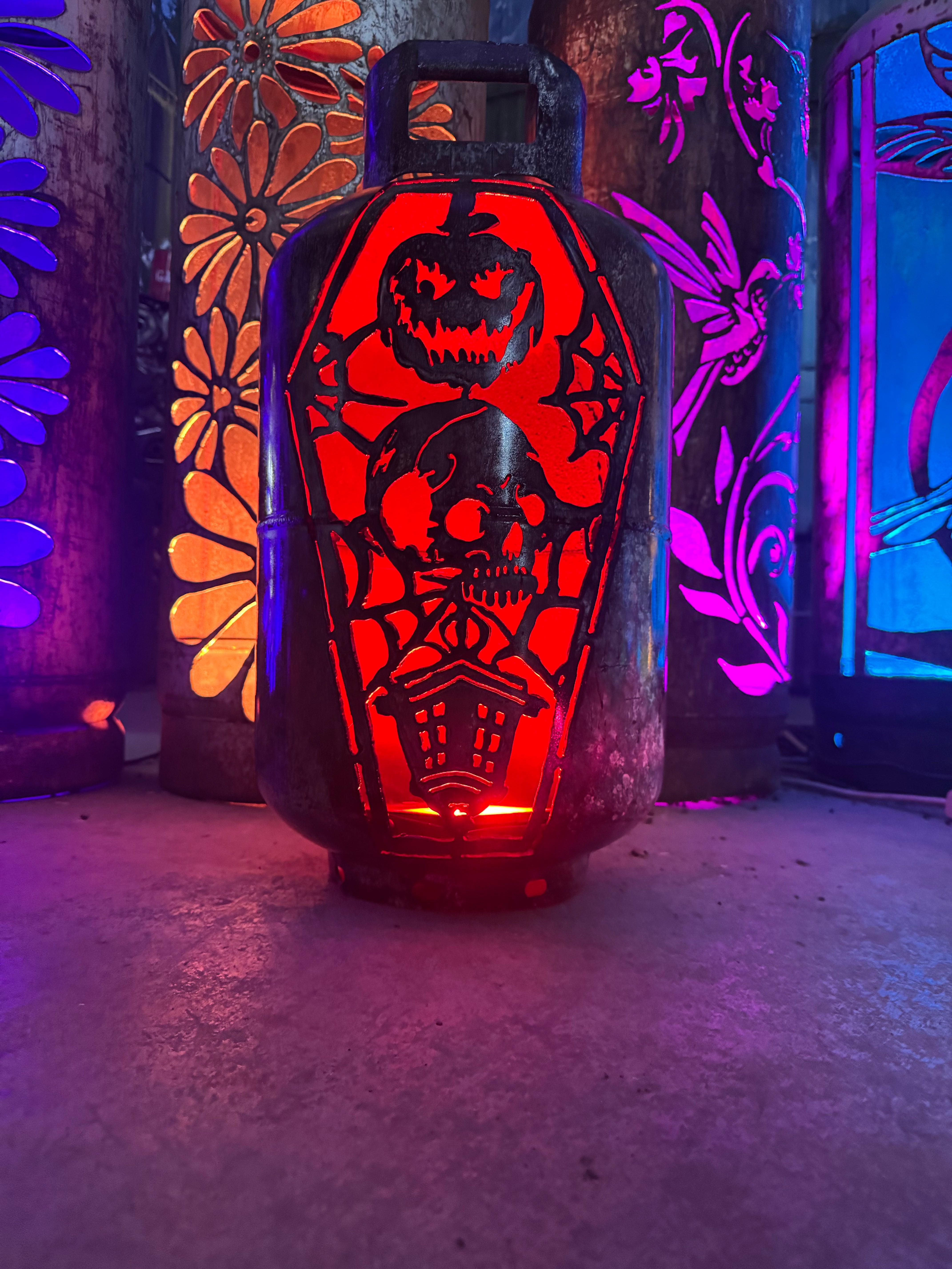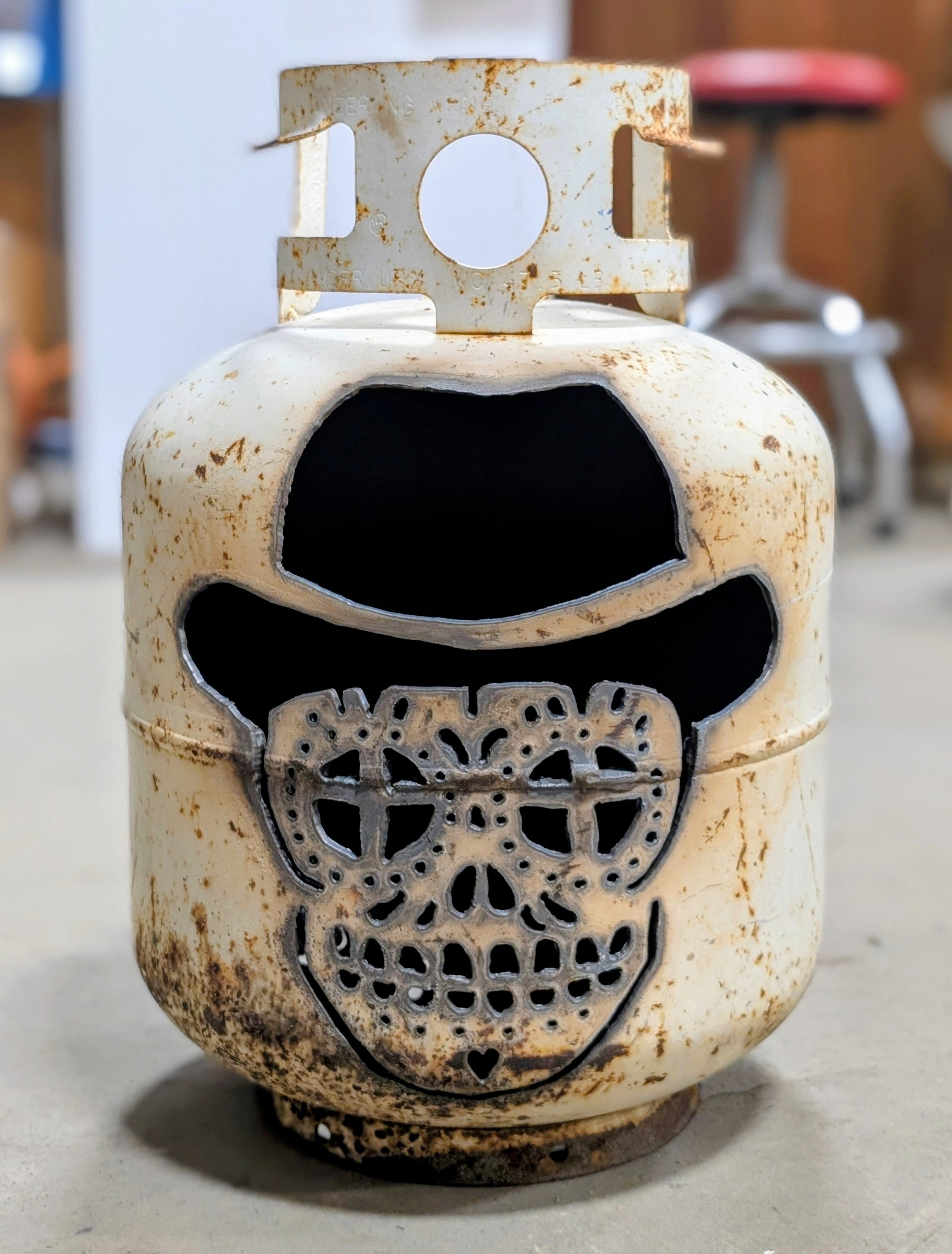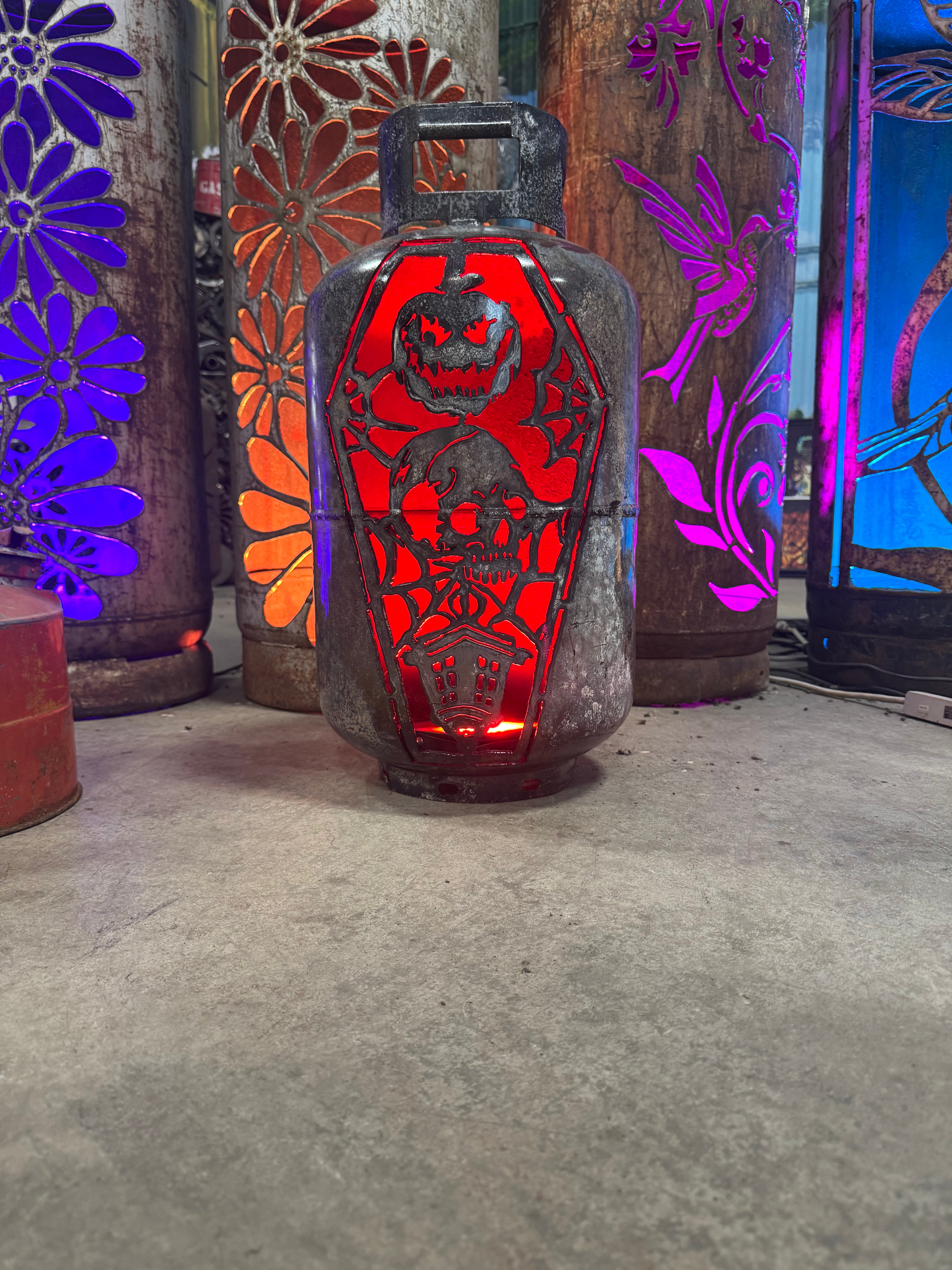 Who says pumpkins have to rot on the porch? These upcycled patio pumpkins bring halloween spirit with a heavy-duty twist. Each retired tank is cut, cleaned, and carved into spooky jack -o'-lanterns, wicked skulls, or eerie haunted faces. The thick cut steel makes them reusable year after year - just drop a LED and watch the glow pour through the cutouts. Perfect for porches, pathways, or even that creepy corner of your yard, they blend rustic salvage with festive fun. A sustainable way to celebrate Halloween, these patio lanterns prove that one person's scrap metal is another's seasonal showstopper!