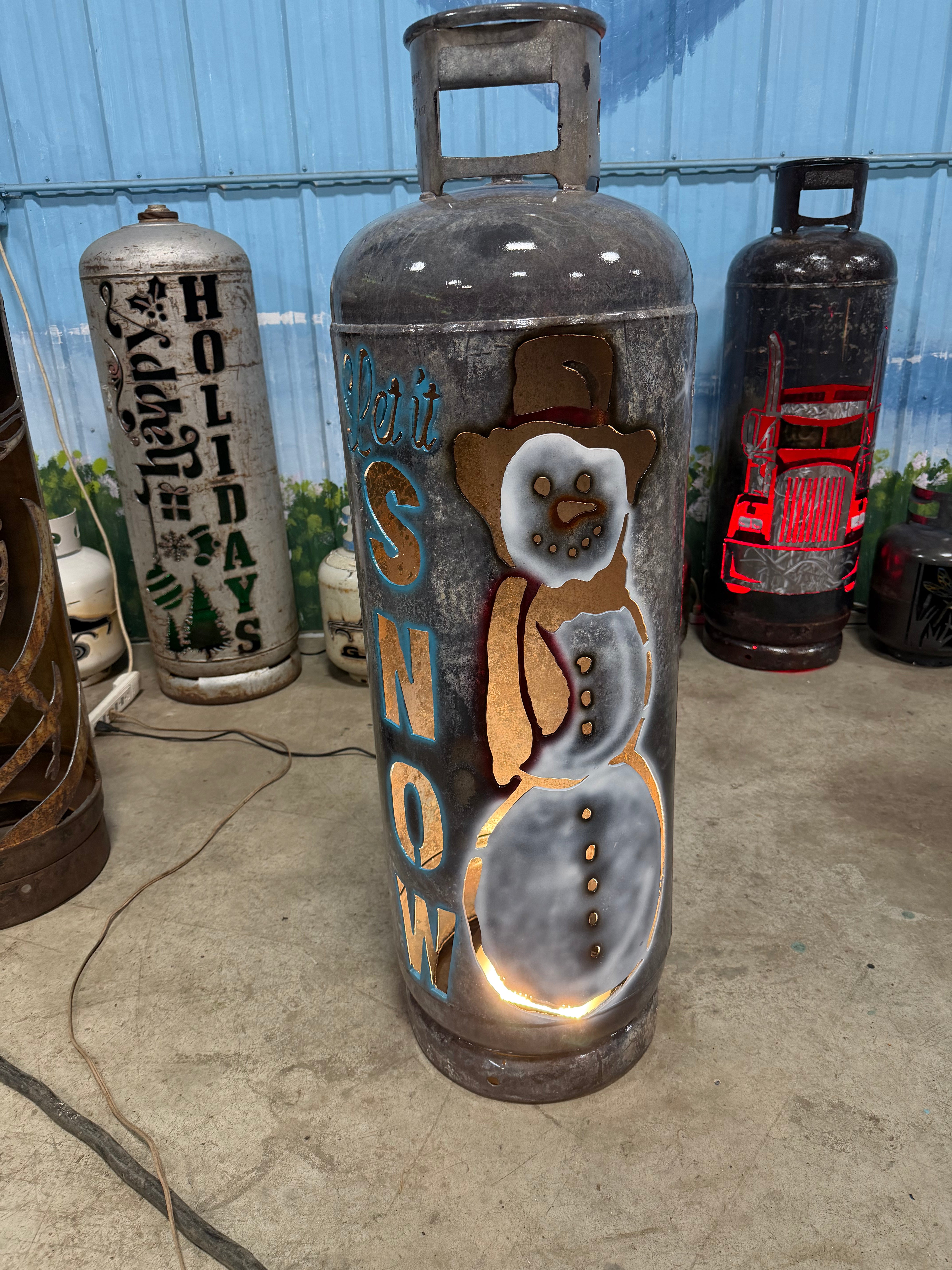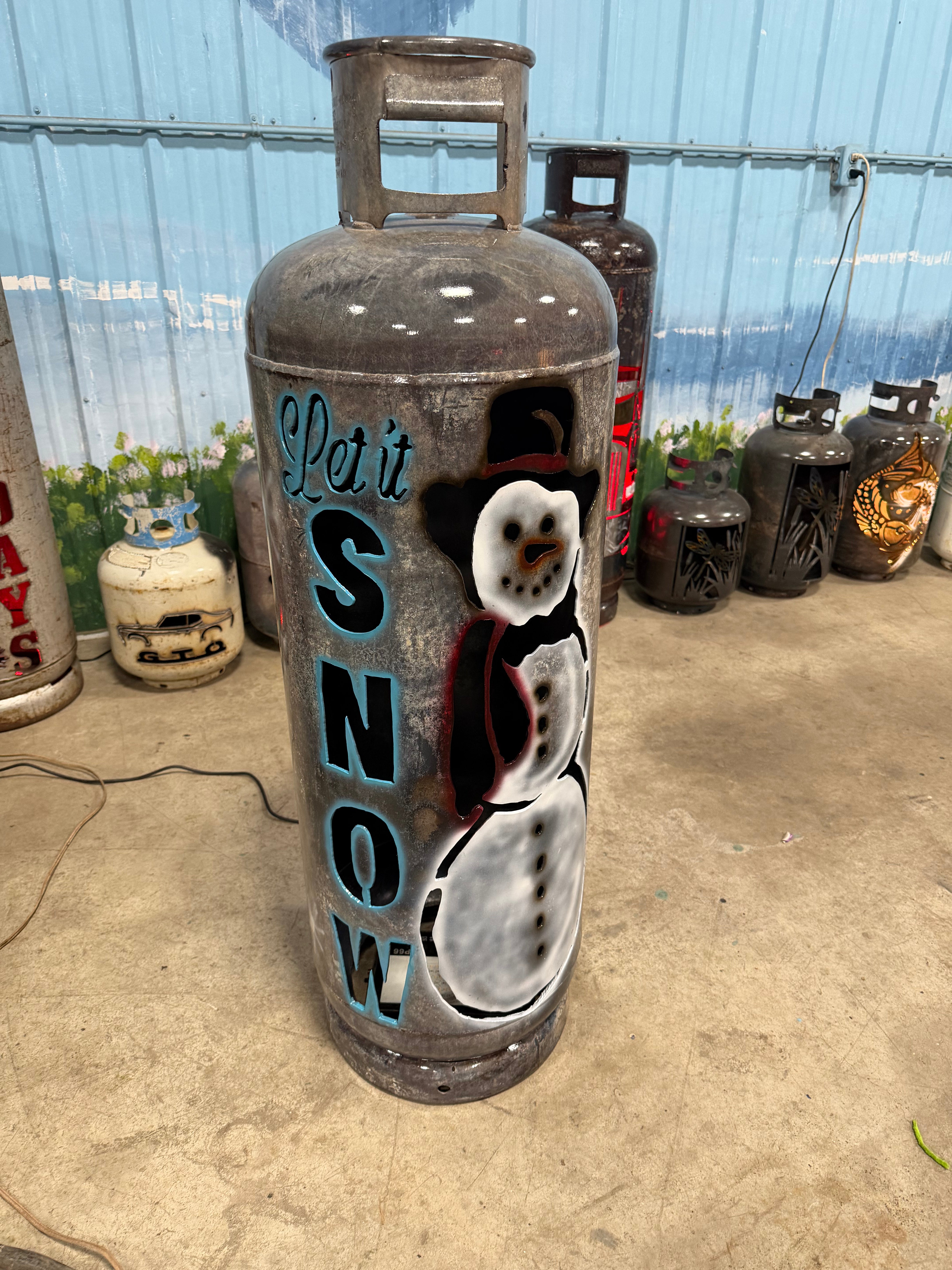 100lb Upcycled Patio Lantern, Let It Snow Snowman Airbrush Patina